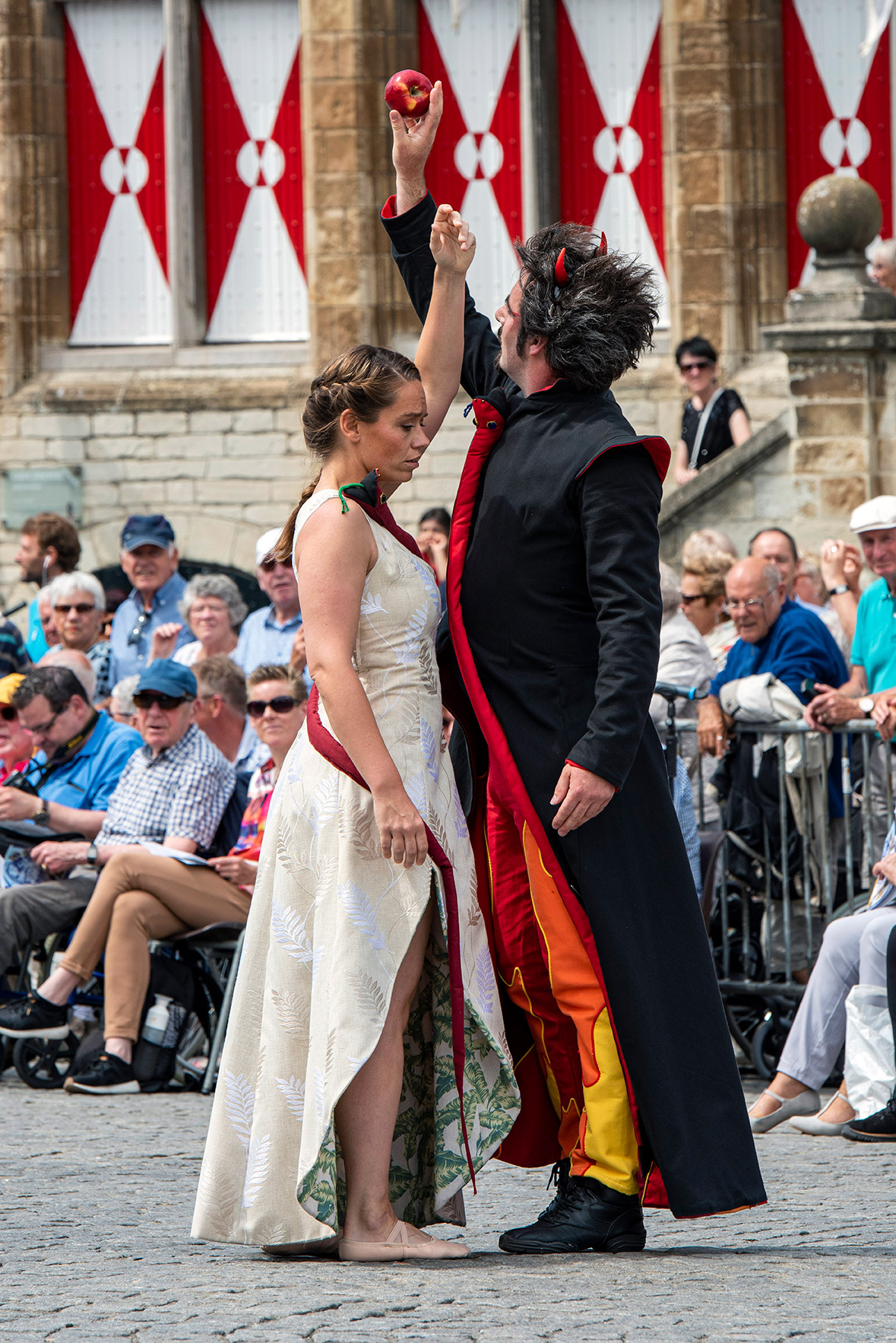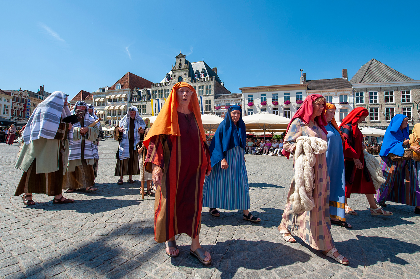 bekende Bijbelse verhaal. - Processie: diverse deelnemers en gastgroepen lopen de processie met daarbij het Maria Ommegangsbeeld.